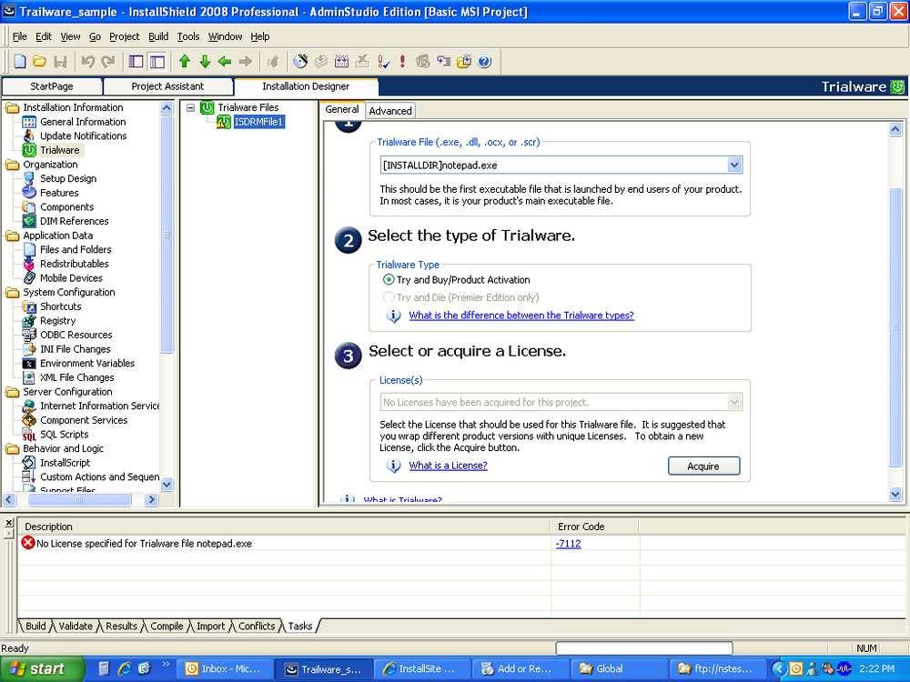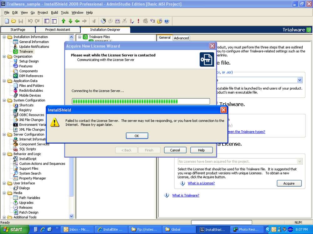 When I click on the Acquire button (Open Installshield IDE-->Installation Information -->Trialware--->Trialware Files-->ISDRMFile1-->General Tabbed Pane-->(3) Select or Acquire a License), It takes to the "Configure Trialware Credentilas" wizard, here i am entering the Descrption, Version, User name & Password(I have created Evaluation Information for Activation Service, i got a mail from loree@macrovision.com which has my login Details), after that i am clicking on the Next button then i am getting the following error message. Please see the attached scrren shot.