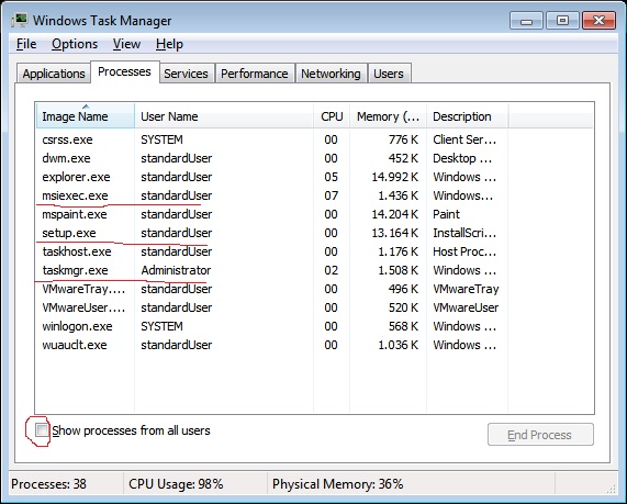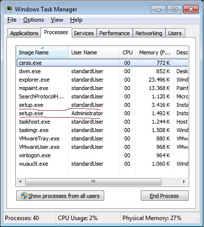 Seltsam, dass hier zwei Instanzen von setup.exe laufen, eine für den standardUser und eine für den Admin. Hast du mal den Taskmanager offen gelassen (und häufig refreshed) während Schritt 4 um zu sehen ob dann auch zwei Instanzen laufen?
