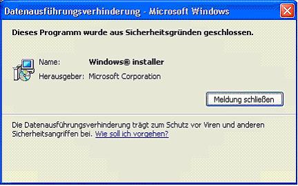 habe herausgefunden, das man in der Registry die folgenden Einträge ändern kann. Dann wird der Dialog nicht angezeigt, weil der Windows Installer als "Ausnahme" in den DEP Dialog eingetragen wird.