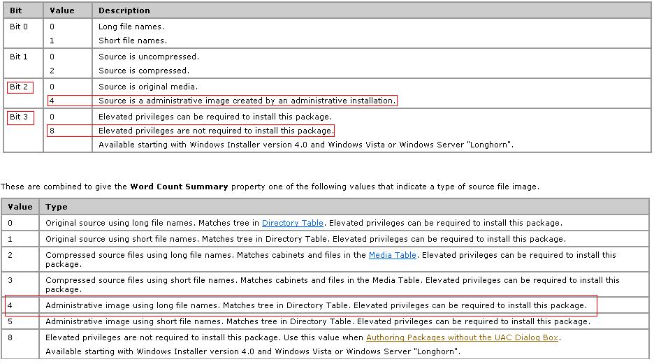 Hi Stefan, we have tested to create the image with Windows Installer 4.0 and 4.5 on Vista but we still get the same result, the Word Count Summary bit is still changed from Bit 3 (Value 8) to Bit 2 (Value 4).